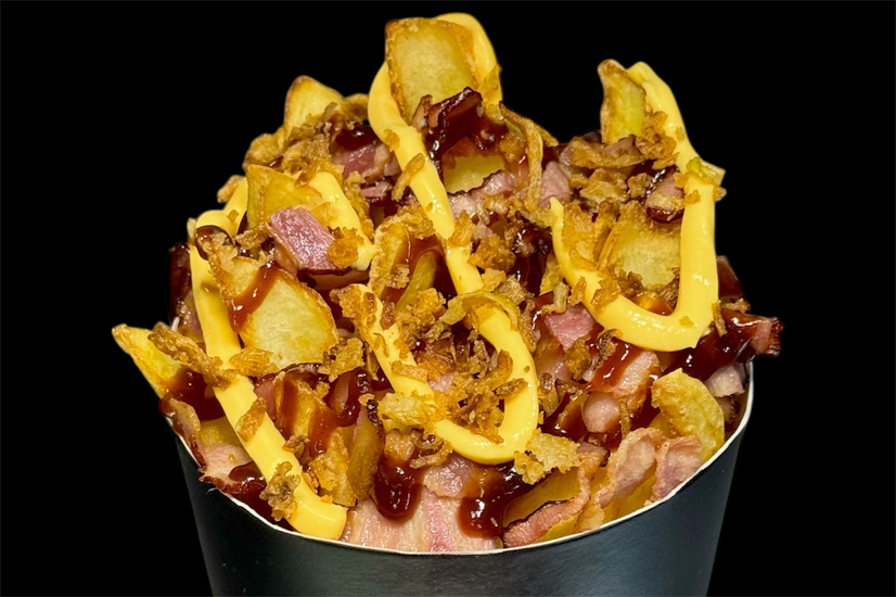 Хрусткі картопляні діпи з ароматним беконом та цибулею кріспі, политі соусом чеддер та bbq