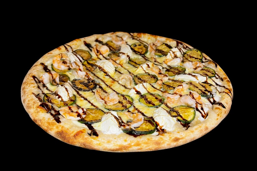 Соус вершковий, сир моцарела, цукіні смажені, креветки, сир філадельфія, бальзамічна глазур, пармезан