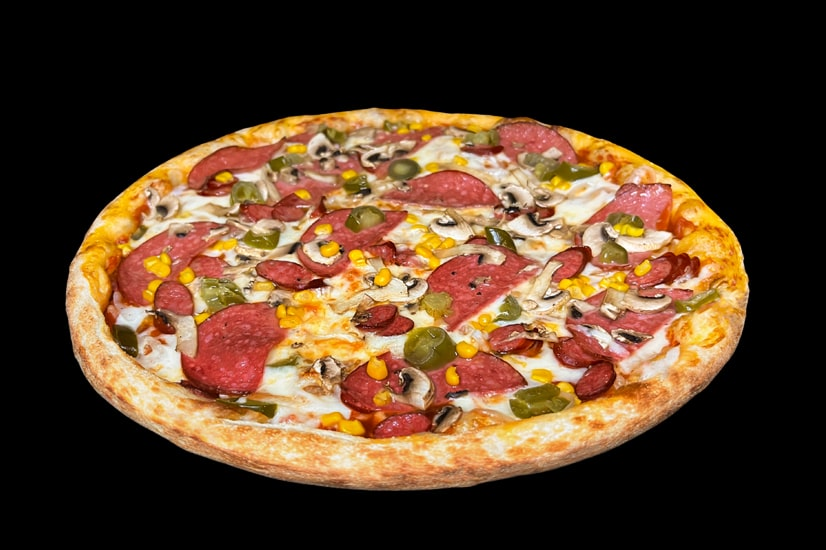 Соус пелаті/кетчуп, цибуля, сир моцарела, салямі горіхова, ковбаски гриль, печериці, кукуруза, перець халапеньйо, орегано