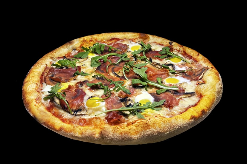 Соус пелаті, сир моцарела, хамон, печериці, перепелині яйця, рукола