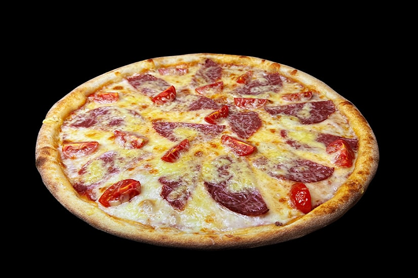 Соус пелаті, сир моцарела, салямі горіхова, помідор коктейльний, маасдам, сир цезар, сир пармезан