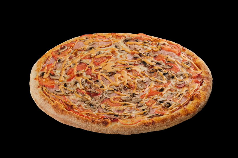 Соус пелаті, сир моцарела, бекон, шинка, печериці, помідори, соус аффілато (гострий), орегано