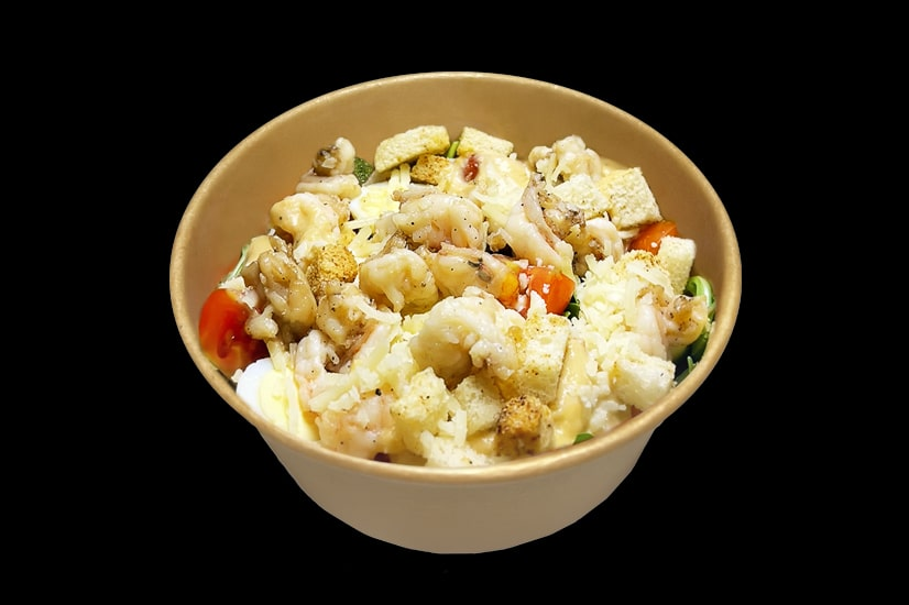Айсберг, рукола, помідор коктейльний, яйця перепелині, креветка, крутони, пармезан, соус біск.