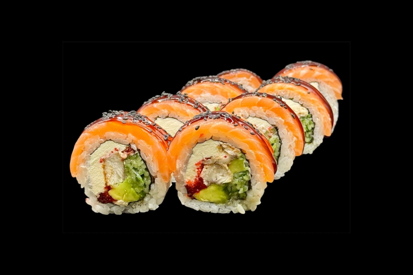 Рис, Крем сир, Лосось, Вугор, Авокадо, Огірок, Ікра тобіко, Кунжут, Соус унагі