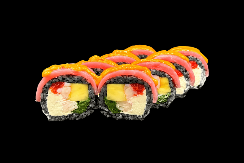 Чорний рис, Крем сир, Креветка, Манго, Шпинат, Ікра тобіко, Тунець, Соус манго-чилі