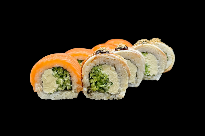 Рис, Крем сир, Лосось, Вугор, Огірок, Мікрогрін, , Соус унагі, Кунжут