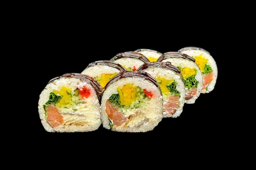 Рис, Крем сир, Норі, Шпинат, Огірок, Перець болгарський, Ікра тобіко, Копчений лосось, Вугор, Соус унагі