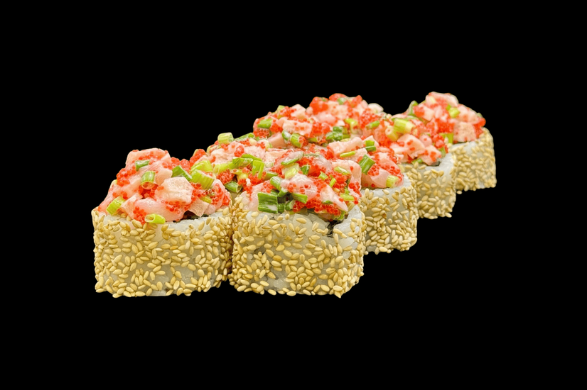 Рис, Крем сир, Копчений лосось, Гребінець, Огірок, Ікра тобіко, Зелена цибуля, Кунжут, Спайсі соус