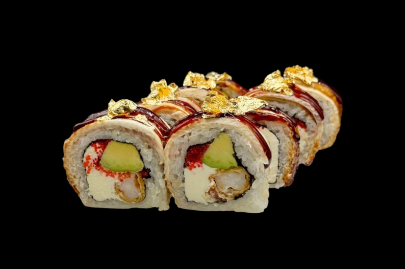 Рис, Крем сир, Креветка темпура, Авокадо, Ікра тобіко, Вугор, Соус унагі, Сусальне харчове золото