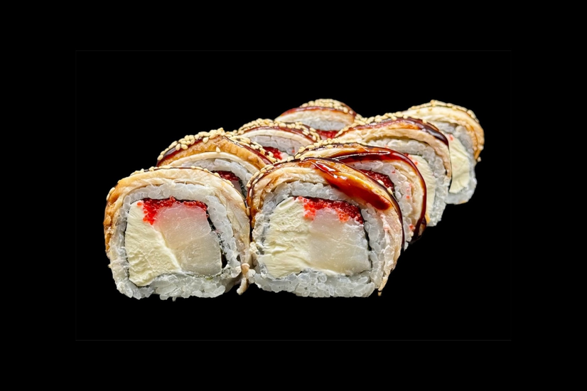 Рис, Крем сир, Вугор, Ікра тобіко, Гребінець, Кунжут, Соус унагі