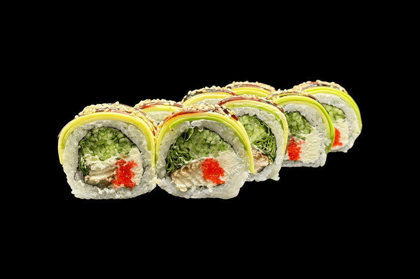 Рис, Крем сир, Вугор, Огірок, Шпинат, Ікра тобіко, Авокадо, Соус унагі, Кунжут