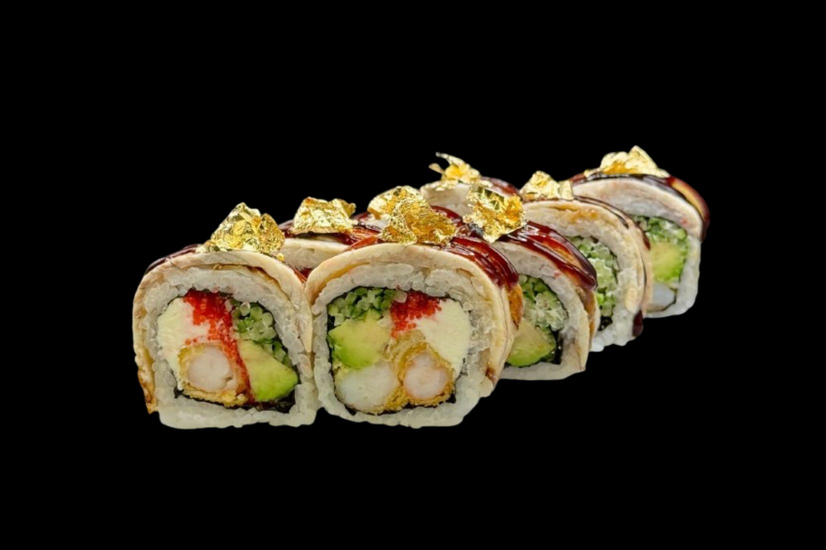Рис, Крем сир, Креветка темпура, Авокадо, Ікра тобіко, Вугор, Огірок, Соус унагі, Рисова локшина у фритюрі, Сусальне харчове золото