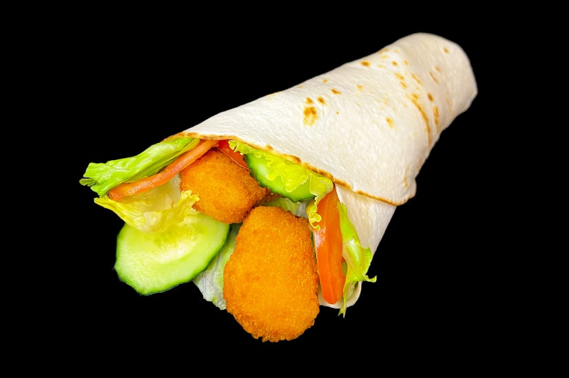 Загорнуте у тортилью: курячі нагетси, соус цезар, огірок, помідор, салат айсберг
